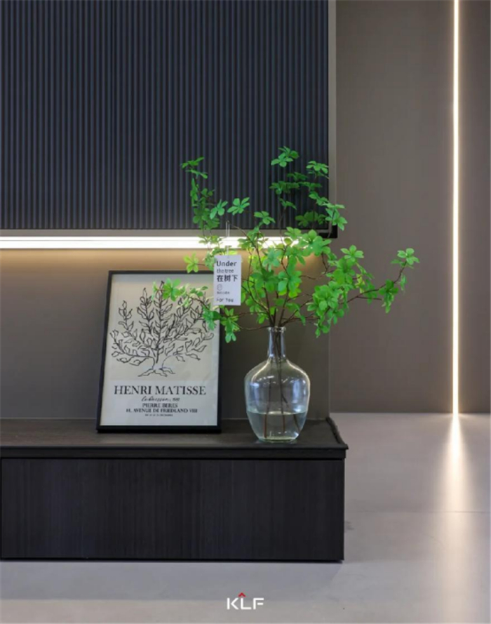 入戶玄關(guān),以內(nèi)斂精致的設(shè)計風(fēng)格,流露出新貴奢感,彰顯現(xiàn)代意式的平衡之美。靜謐的灰融化于玄關(guān)柜,啞光質(zhì)感低調(diào)奢華,黑胡桃木背板內(nèi)斂大氣,搭配線條感十足的木格柵,層次豐富的材質(zhì)拼接,流露出藝術(shù)氣息與都市風(fēng)尚。