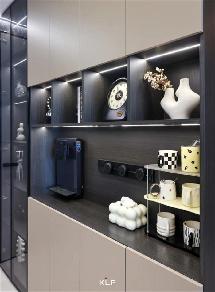 經(jīng)過光影的催化,一番溫和自然的生活圖景便呈現(xiàn)在眼前。低飽和度的素色渲染出寧靜淡雅的調(diào)性,整面通頂餐邊柜中間做挖空設(shè)計,放置常用物品,安裝軌道插座,讓餐廳功能更加強大。