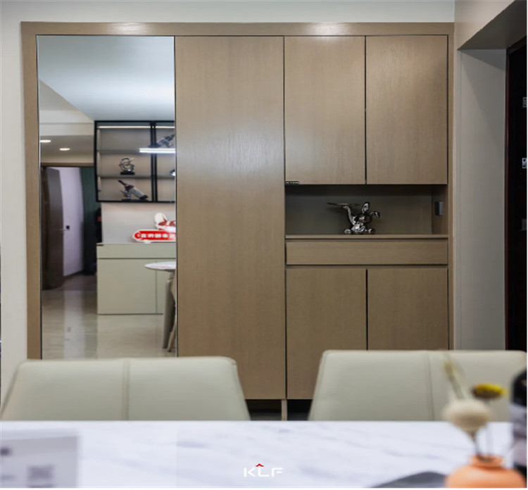 餐邊柜與護墻板色調(diào)統(tǒng)一,顯得空間和諧寬敞;玻璃吊柜內(nèi)置燈帶,既起到調(diào)節(jié)大面積茶白色帶來的素凈氛圍,又很好呈現(xiàn)輕奢風(fēng)強調(diào)的精致細節(jié);免拉手設(shè)計簡約實用,也減少日??呐?。