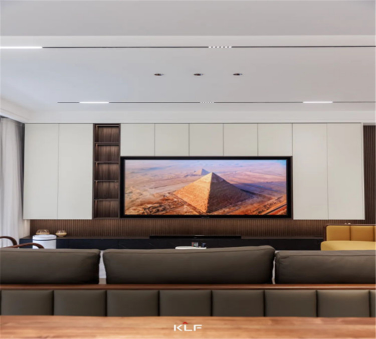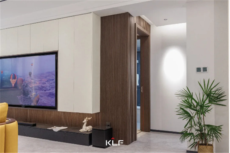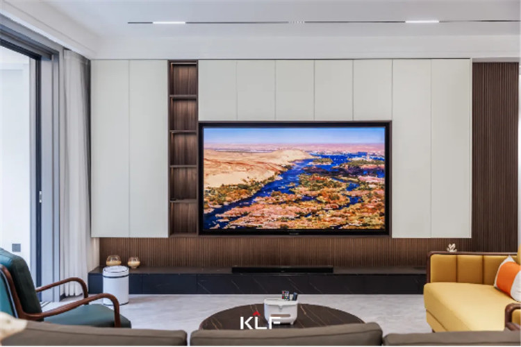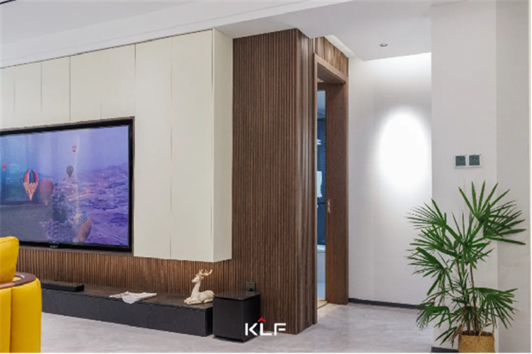 細格柵的造型墻板為墻面增加了立體感,一字型深灰色地柜直接落地,內(nèi)嵌3D霧化暖爐,帶給家更多溫馨。