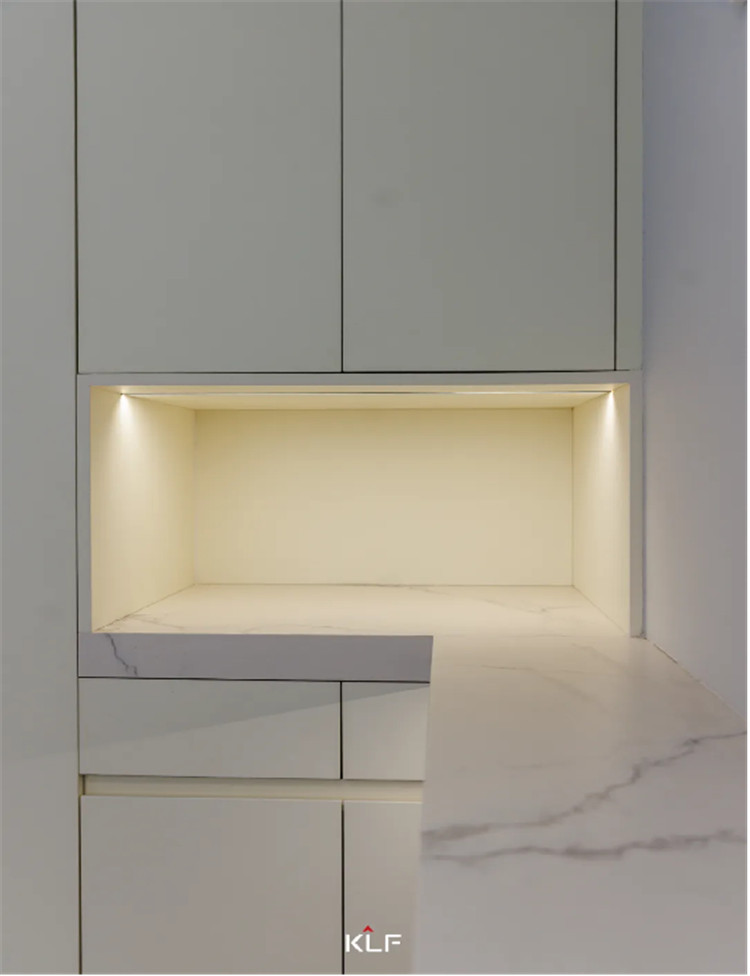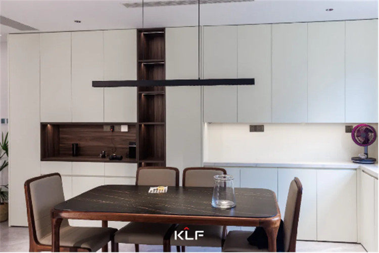 櫥柜在下方柜體中加入抽屜的設計、吊柜中部穿插玻璃展示柜更顯通透。無論是櫥柜還是餐邊柜,柜體都無明裝拉手,讓這個空間在生活的藝術中變得更高級、更有內(nèi)涵。