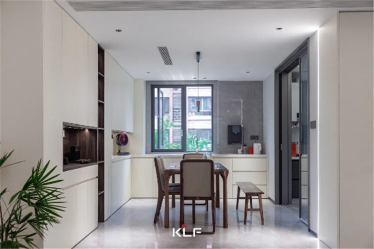 餐廚空間的設計風格與起居空間保持一致,除了傳統(tǒng)的U型封閉式中廚外,在用餐區(qū)還做了高定全屋圍合的設計。