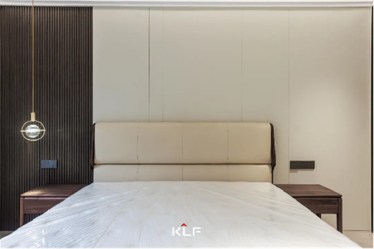 主臥的床頭背景也頗有意蘊,將拉槽墻板與格柵墻板進行拼接,增加層次感和設計感,白棕配色高級又內(nèi)斂,是追逐質(zhì)樸生活的文雅格調(diào)。