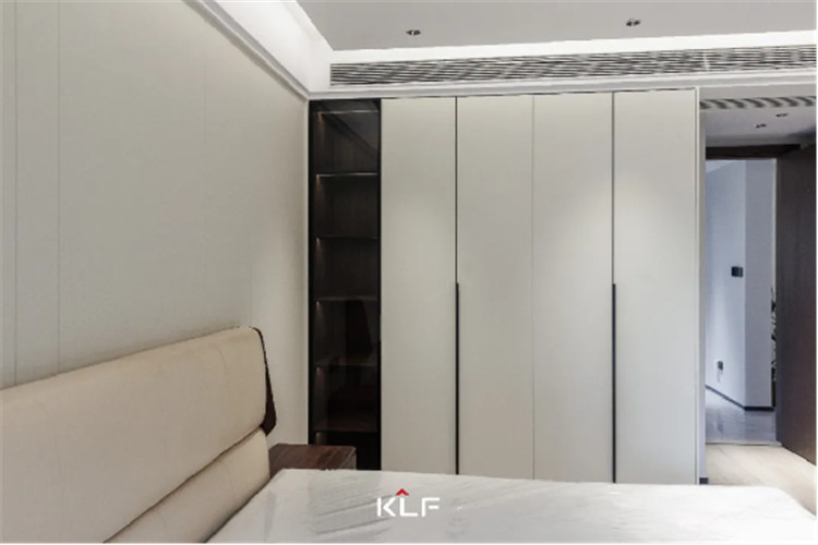 主臥空間延續(xù)一貫簡約的設計手法,注重提升家居質(zhì)感,強調(diào)人文的居住感受。自客廳格柵背景墻延伸至臥室空間,做成一體化的門套門框及門扇。
