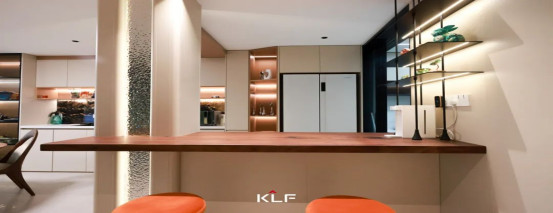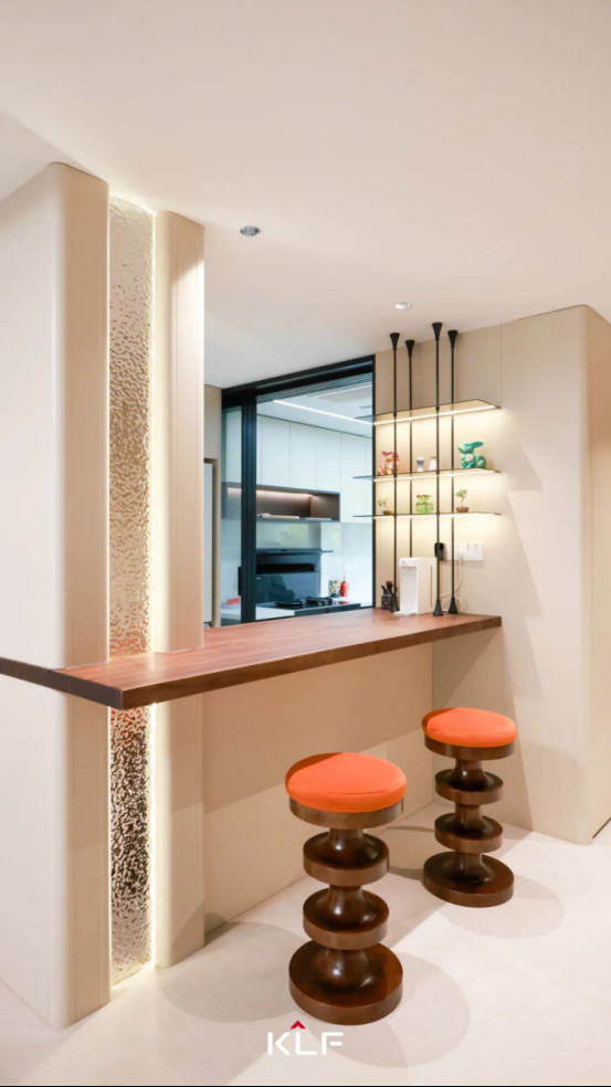 開(kāi)放式布局帶來(lái)通透的視野,半墻吧臺(tái)清晰劃分功能場(chǎng)域,同時(shí)賦予生活更多互動(dòng)可能。木質(zhì)臺(tái)面?zhèn)鬟f溫潤(rùn)樸拙的自然意趣,開(kāi)放式層架和隔斷立柱內(nèi)嵌光源氤氳柔和光暈,為空間勾勒立體層次。流動(dòng)的生活百態(tài)匯入其中,一場(chǎng)物簡(jiǎn)心悅的自由在這里得到充分施展。