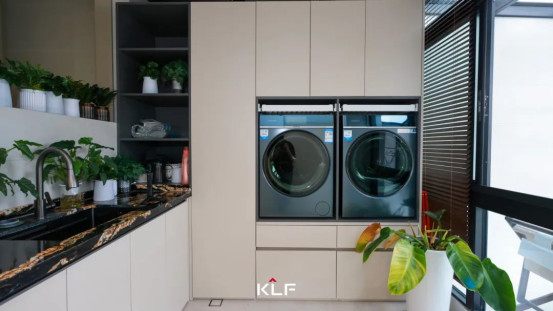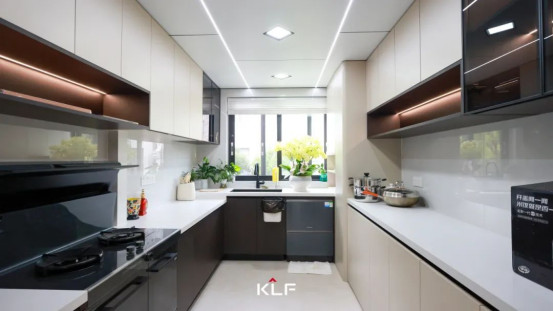 廚房引入充沛自然光線,讓備餐過(guò)程浸潤(rùn)在明亮、清新而愉悅的氛圍里。整體櫥柜以U型布局承載著高效收納,保證了動(dòng)線的流暢便捷,灶具、烤箱等現(xiàn)代化電器嵌入柜體,構(gòu)筑出功能完備又不失平整利落的料理中心。
