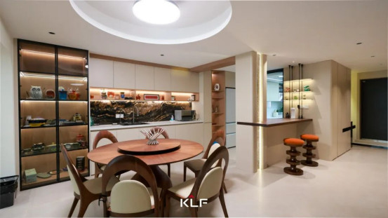 一張溫潤(rùn)可鑒的原木餐桌占據(jù)視野中心,家人圍坐,意興而聚,生活滋味蔓延而生。餐邊柜以形式追隨功能為設(shè)計(jì)內(nèi)核,擁抱生活的瑣碎與溫暖。一門(mén)到頂?shù)墓耋w縱向拔升氣度,精妙的展藏美學(xué)演繹層次敘事,上柜與下柜的經(jīng)典分割,則在嚴(yán)謹(jǐn)秩序中注入功能分區(qū)的考究,兼顧視覺(jué)平衡與日常取用的便捷。