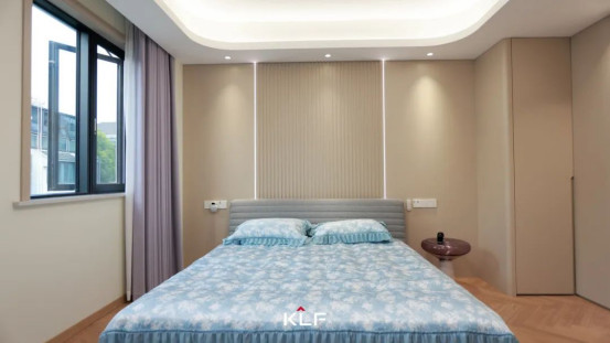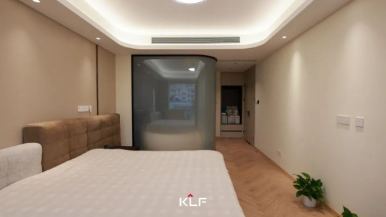 淺棕色墻板以橫縱交錯(cuò)的凹槽線條解構(gòu)平面單一性,光影在其間律動(dòng)游走,明暗交織,迸發(fā)深邃立體的視覺(jué)張力。臥室吊頂以圓弧柔化建筑棱角,每一道弧度皆為理性計(jì)算后的感性詩(shī)篇。