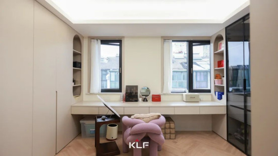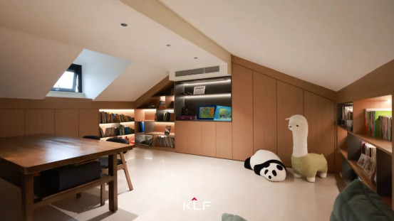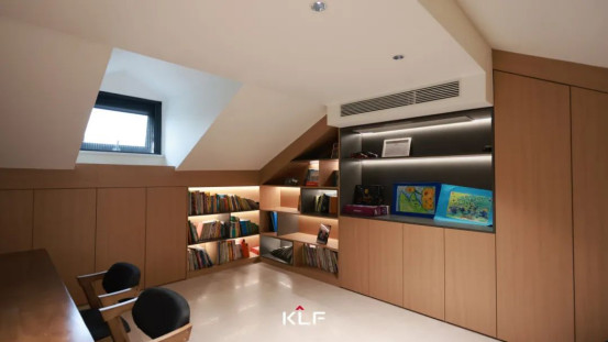 頂層閣樓打造與屋頂構(gòu)造完美貼合的書(shū)柜,錯(cuò)落有致的布局,緩緩展開(kāi)一處氤氳著書(shū)香的精神桃源。簡(jiǎn)練線條與溫潤(rùn)原木色澤,奠定了開(kāi)闊、明亮而沉靜的舒心氛圍。日暮時(shí)分,余暉滿窗,不妨專(zhuān)注閱讀與思考,與落日、微風(fēng)共赴一場(chǎng)心靈之約。