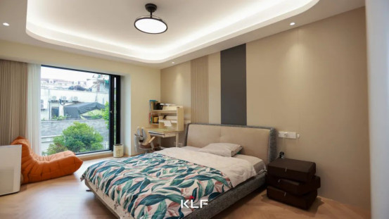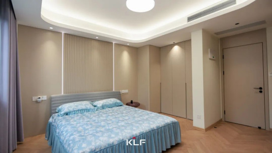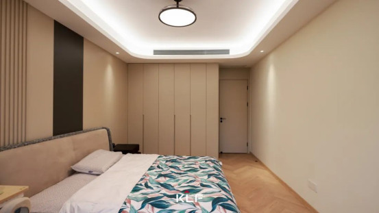 長(zhǎng)輩房回歸簡(jiǎn)單與純粹,以隱藏式光源與點(diǎn)光組合重塑空間,光線如絲絨般柔和鋪展,明暗層次在墻面、柜門(mén)間自然暈染。門(mén)墻柜一體化設(shè)計(jì),木作的輕盈肌理與純凈氣息共振,圍合出一個(gè)純粹無(wú)壓且滿溢寧?kù)o的安眠詩(shī)境。