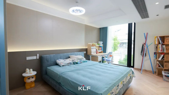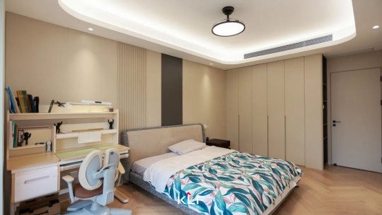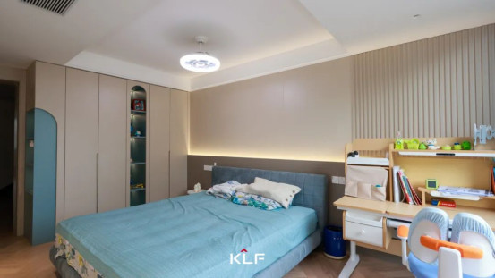 兒童房以意式基因解構(gòu)童真宇宙,以高級(jí)灰階包裹天馬行空。半高墻板與豎向格柵構(gòu)筑起夢(mèng)幻結(jié)界,一門(mén)到頂柜以拱形開(kāi)放格豐富視覺(jué)層次,靈動(dòng)撞色讓每個(gè)日常都成為美學(xué)啟蒙課。隱藏?zé)魩а毓耋w脈絡(luò)悄然漫射,朦朧光暈驅(qū)散通頂立面的厚重感,渲染出溫馨舒適的居家溫度。