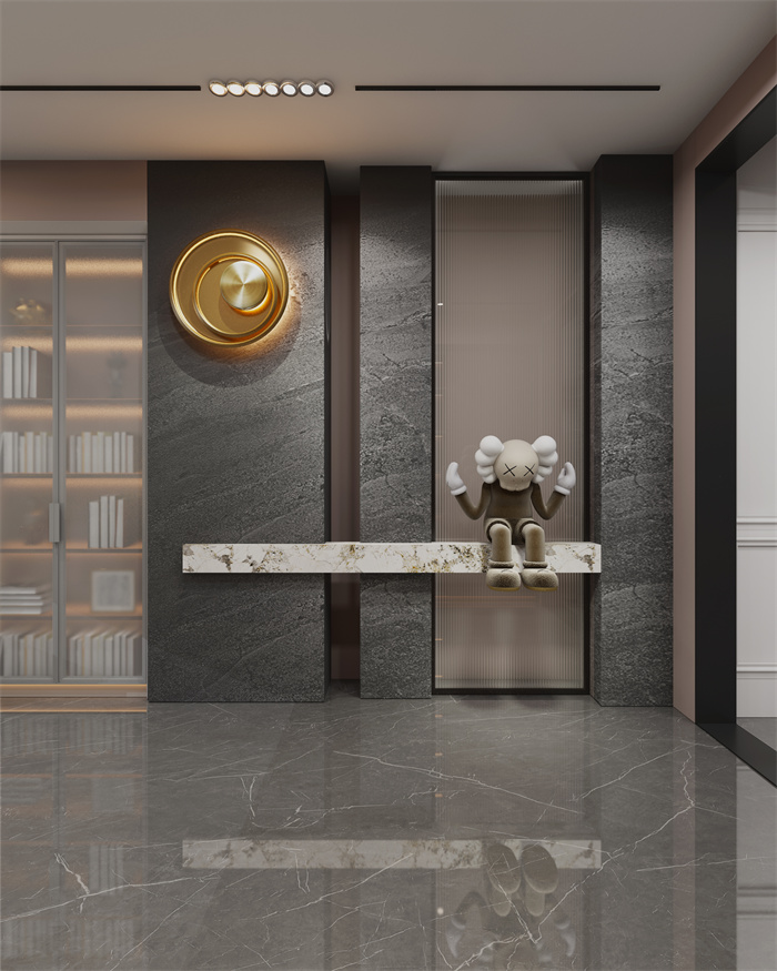 ?戶空間造景區(qū)與鞋柜相互呼應(yīng),精致的?虹玻璃作為情緒與視覺的點睛,填充空間空?的同時,也衍生出生活美學(xué)的設(shè)計感與儀式感。