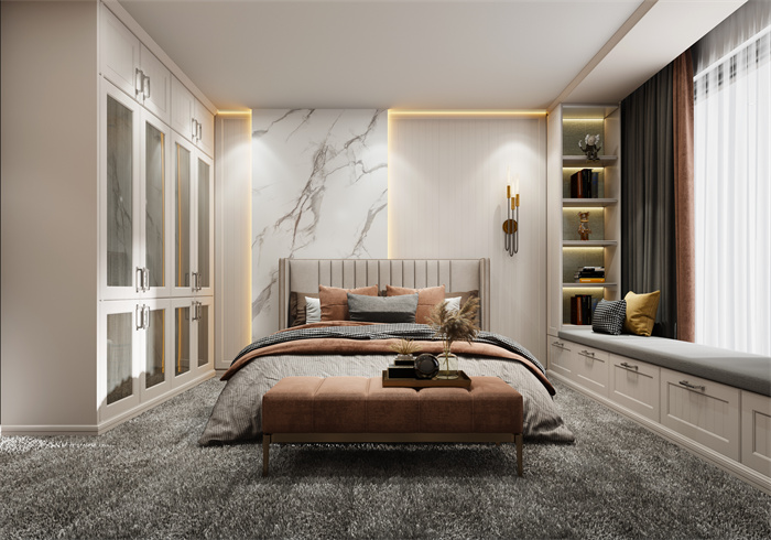 臥室的柵格背景墻和模壓護墻,做出了?定混油的產(chǎn)品效果,超晶板和巖板等超現(xiàn)代感的元素的融入, 更是將簡歐這?經(jīng)典風(fēng)格產(chǎn)品做了顛覆,更符合當下消費?群讓客戶生活更加自然。