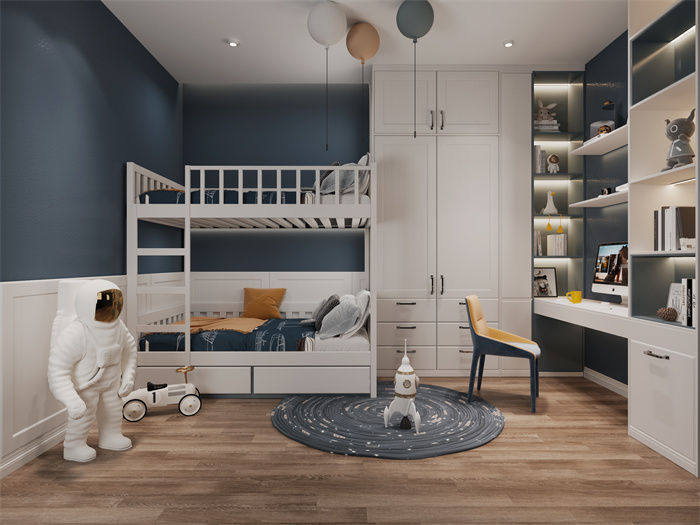 兒童房空間延伸了設(shè)計的?彩主題,不同飽和度的藍色配合深邃的星空藍,冷靜并充滿思考,L形的設(shè)計也被充分利用。