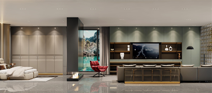 像電視柜的整體抬高設(shè)計,讓業(yè)主在家即能舒適看??;無把手柜門設(shè)計,簡潔利落,增強視覺美感;衣柜的升降拉桿設(shè)計,滿足家庭不同成員的需求。
