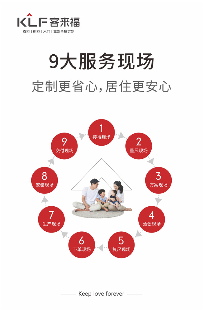 此外,客來福還以接待,量尺,方案,洽談,復(fù)尺,下單,生產(chǎn),安裝,交付九大服務(wù)現(xiàn)場保障廣大客戶的“幸?!鄙睢?/span>