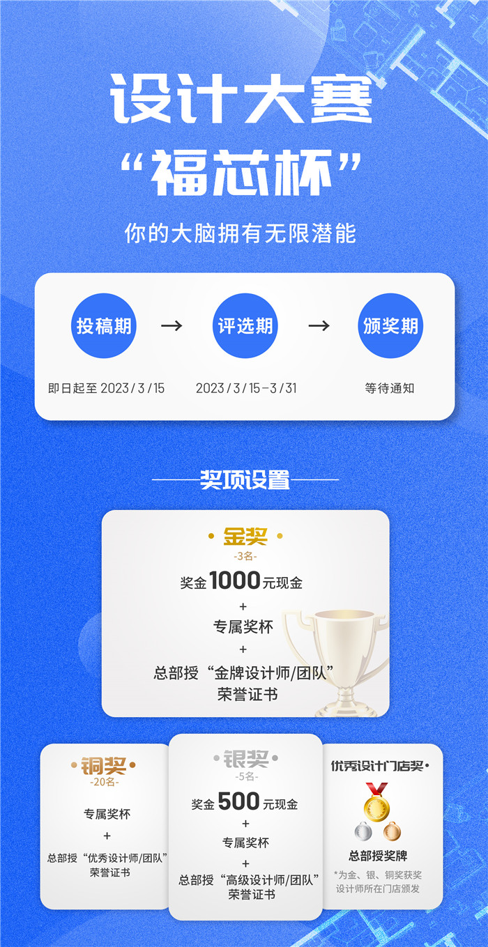 今天,客來福“福芯杯”面向全國(guó)客來福體系的經(jīng)銷商設(shè)計(jì)師、直營(yíng)店設(shè)計(jì)師、總部設(shè)計(jì)類相關(guān)崗位(個(gè)人或團(tuán)隊(duì))而來,期待靈感的碰撞、創(chuàng)意的集結(jié)、原創(chuàng)的生命力!