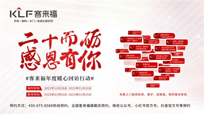 往年,客來福一直堅持在新春來臨之際為大家在寒冷冬天送上暖心服務,免費為大家上門檢修、維護、送祝?!,F(xiàn)如今,客來福年度暖心回訪活動正在火熱進行中,將以更加熱情和飽滿的精神持續(xù)發(fā)力。“二十而礪,感恩有你”,不論多久、不論多遠,只需一個預約。