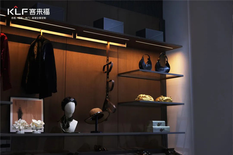 整體空間以藍(lán)琺瑯和茶白的色彩碰撞打造家居美學(xué),衣帽間開放柜內(nèi)采用了超薄層板設(shè)計(jì),設(shè)計(jì)不冗繁,營造出空間懸浮感。