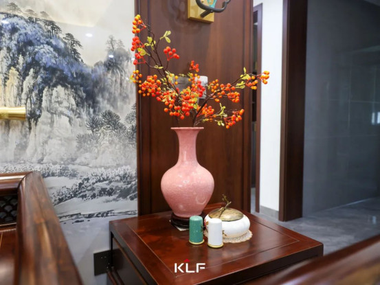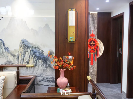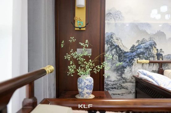 壁燈與插花平添意趣,高低錯落間演繹中式器物之美,視覺層次豐盈而不雜亂,文化基因的當代轉(zhuǎn)譯,在靜穆中注入生機。柔光似月華暈染,成就一方恬淡中和、可棲可游的東方禪境。