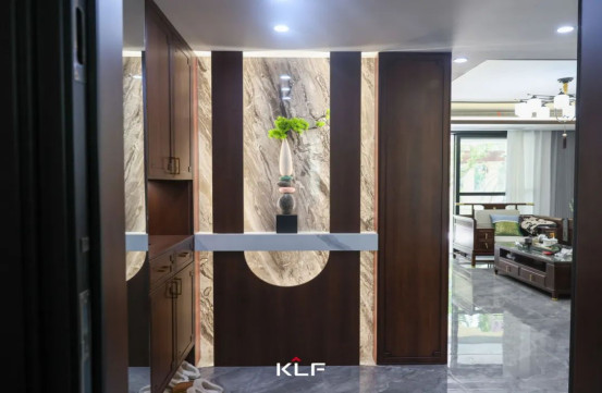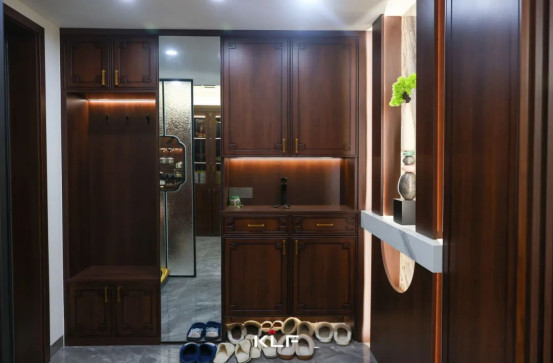 玄關(guān)柜以沉穩(wěn)的胡桃木色構(gòu)建視覺基底,通頂穿衣鏡迎接歸家步履;柜體底部鏤空,方便換取常穿鞋履;中部鏤空,能隨手放鑰匙等物品。柜門摒棄繁復紋飾,突出溫潤質(zhì)感,暗合“以簡為貴”的中式審美內(nèi)核。