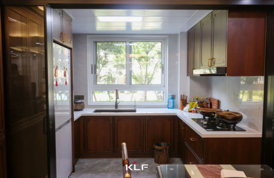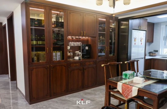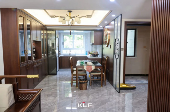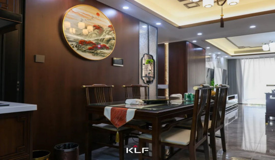 胡桃木墻板包裹墻面,木紋間可感受到萬物能量的流動,詮釋“大音希聲,大象無形”的自然氣韻。餐廳整體流線設計,采用了傳統(tǒng)園林中隔而不斷移步換景的透景手法,融入古典窗欞造型的鏤空玻璃隔斷,恰似國畫中的飛白筆觸,虛實相映,韻味無窮。