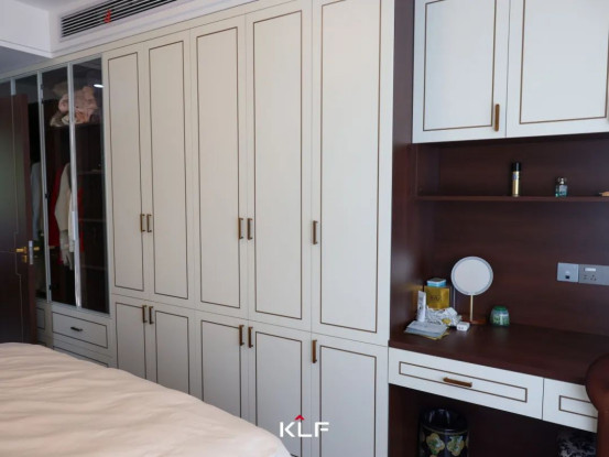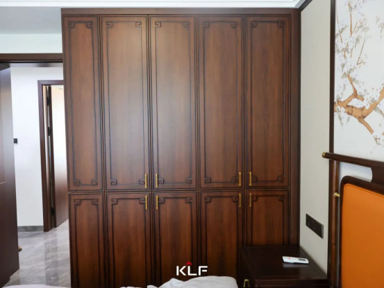 定制床尾柜,柜體盡頭采用進退手法劃分出懸浮梳妝區(qū),“上掛下抽”布局進一步豐滿視覺層次感。滿墻收納系統(tǒng)消隱于簡約柜門之后,呈現(xiàn)新中式主義“形式追隨功能”的終極解答,打造材質(zhì)碰撞的私屬領域,構(gòu)建居寢合一的復合場景。