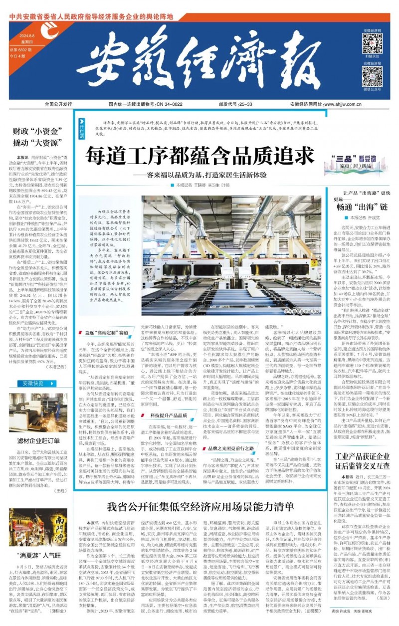 日前,安徽省工業(yè)和信息化廳聯(lián)合安徽經(jīng)濟報推出《“三品”看安徽》系列報道,走進輕高定家居品牌客來福,聚焦在家居領(lǐng)域的創(chuàng)新成果。作為安徽“增品種、提品質(zhì)、創(chuàng)品牌”戰(zhàn)略的踐行者,客來福非常榮幸能夠代表安徽家居行業(yè),展示我們在高端定制領(lǐng)域的探索與成效。